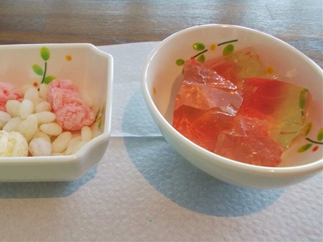 おやつは雛あられと手作りの二色ゼリーです