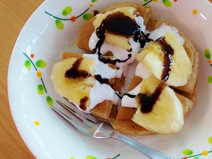 下の写真は、プリンアラモードを食べている写真ですが、
